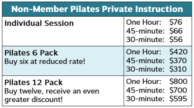 Pilates private instruction is a great way to make progress toward your specific goals and needs. Private lessons are available for RAC members and non-members, with package pricing discounts. If you are a new member, your New Member Personal Training sessions can be used to try Pilates private instruction.