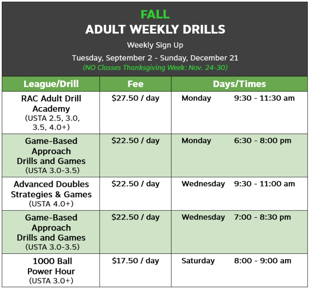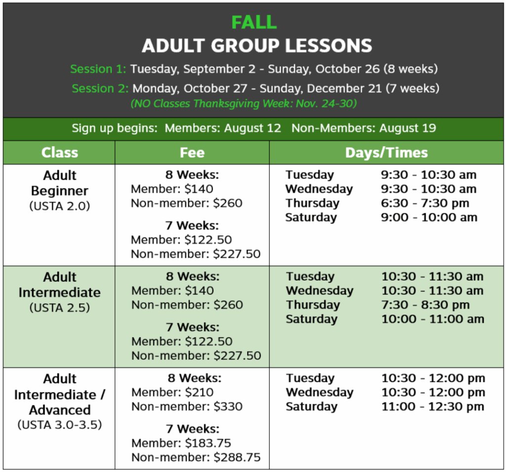 Adult group lesson classes (beginning, intermediate, and advanced levels) are the training ground for most of our new adult players. We also offer a variety of drills, games, mixers, and special events to engage all levels of tennis players. These are a great opportunity to learn from our pros, improve your game, meet new friends, and enjoy playing tennis!
