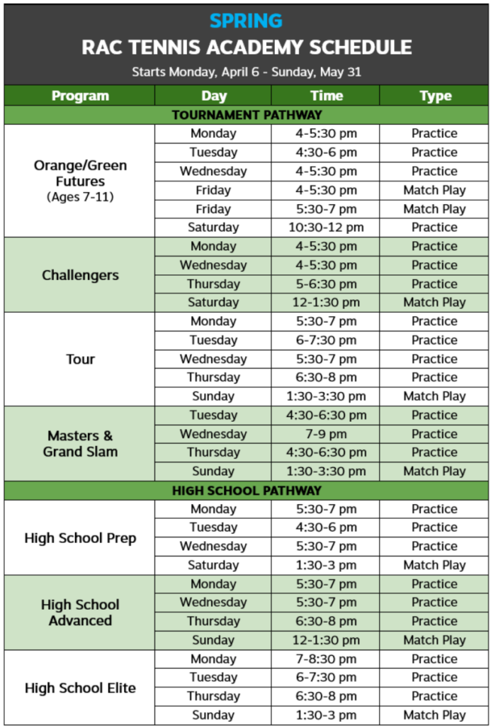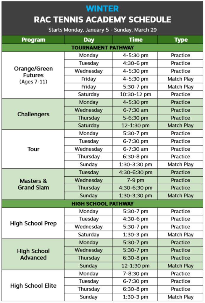 This invitation only program is for players who have graduated from the ROGY tennis program. There are two pathways available: the Tournament Pathway or the High School Tennis Pathway.